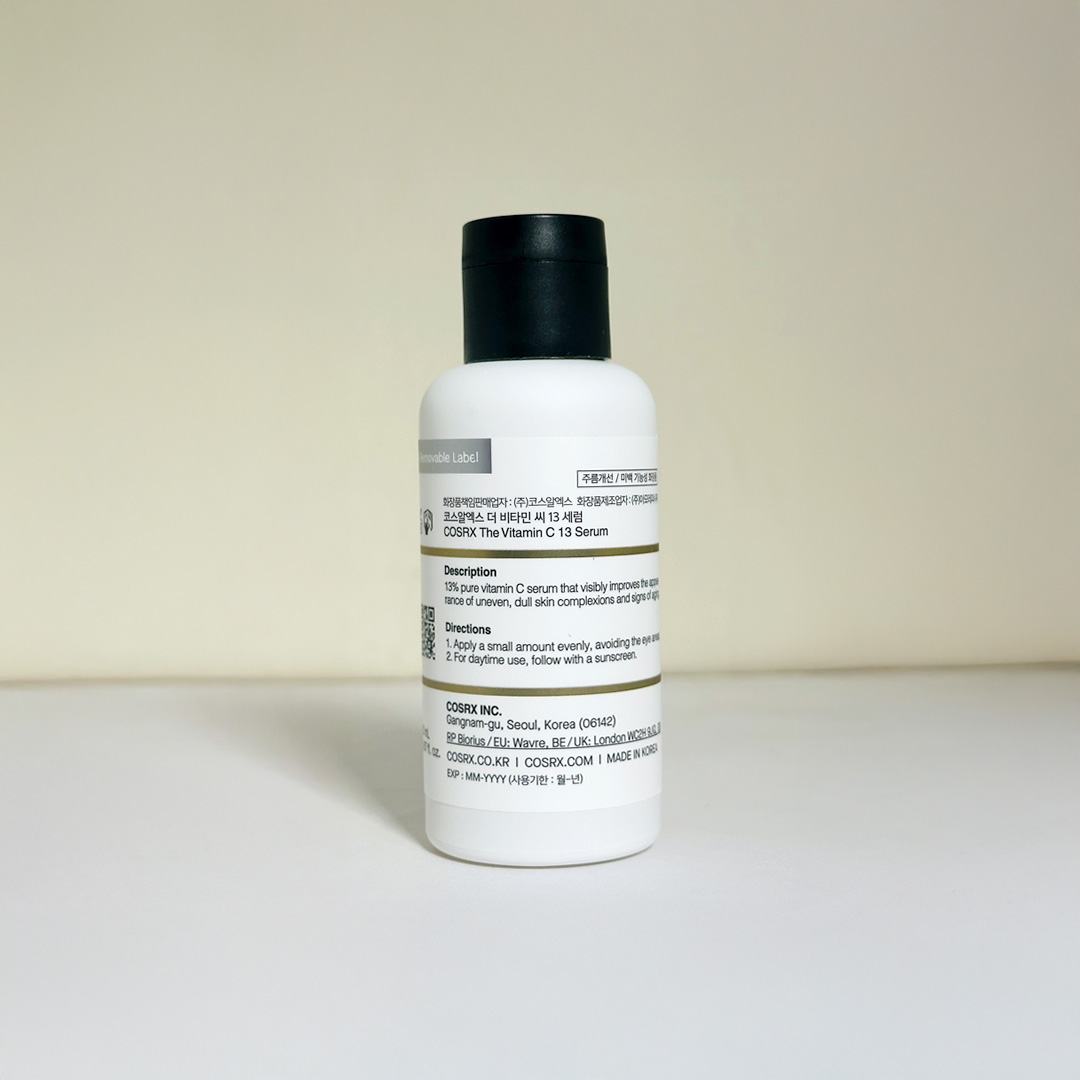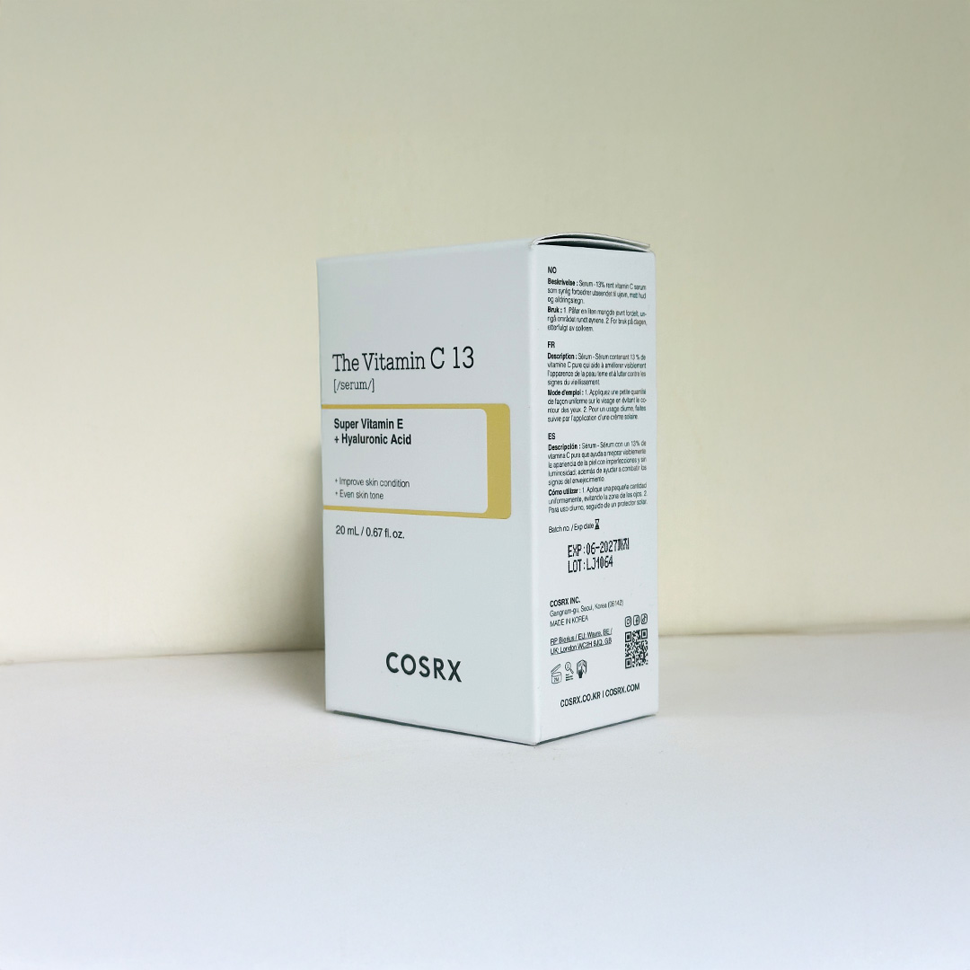 Vitamin C is a celebrated ingredient in skincare for its brightening and anti-aging properties. It is a powerful antioxidant that helps neutralize free radicals, which are unstable molecules that can damage skin cells and accelerate aging. By incorporating Vitamin C into your skincare regimen, you can protect your skin from environmental stressors such as UV rays and pollution. In addition, Vitamin C is known for its ability to fade dark spots, hyperpigmentation, and acne scars. The 13% concentration of Vitamin C in COSRX Vitamin C 13 Serum makes it effective in delivering visible results, reducing the appearance of dark spots, and brightening the overall complexion without causing irritation or sensitivity, making it suitable even for those with sensitive skin.