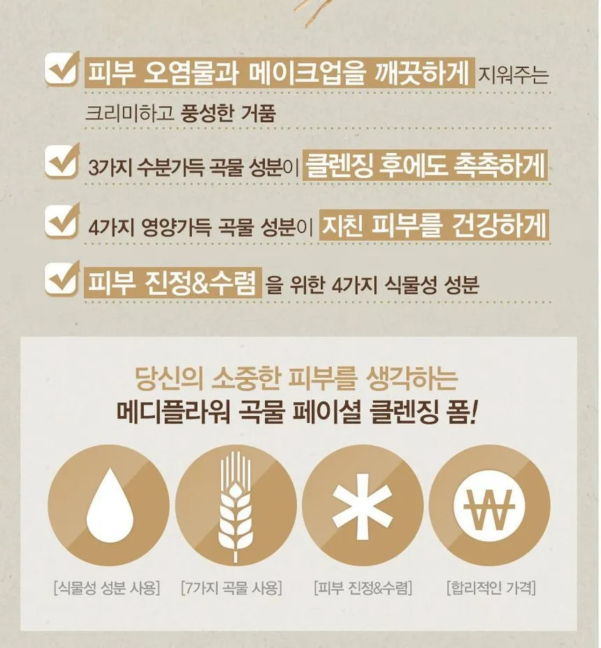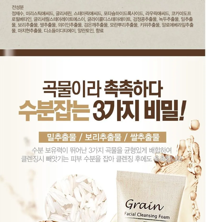 A creamy cleansing foam formulated with 7 kinds of grain which removes impurities, makeup, dirt completely featuring soothing effect. Contains Wheat, Barley, Rice extracts which make your skin stay hydrated after cleansing.